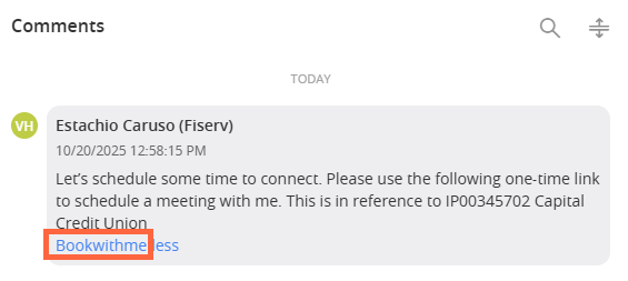 You can also schedule a meeting with your Fiserv associate within the Comments tab. First, communicate to the associate that you would like to set up a meeting. Next, the associate will send you a URL that you can select. This URL takes you to the associate's calendar with their availability.