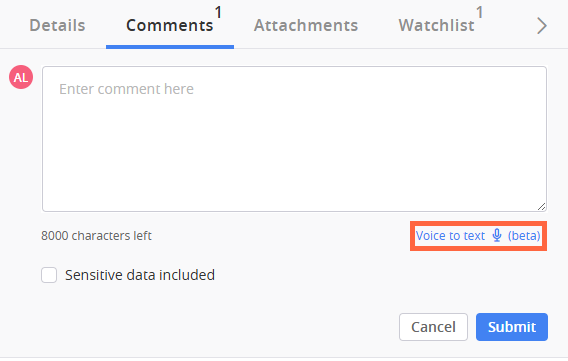 To use the voice to text feature, select Voice to text below the comment box. After you select the button, Client360 begins recording. Verbalize your comment in a clear way for Client360 to pick it up.