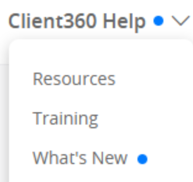 Training: links to the Client360 Training section, where you can view and register for upcoming trainings, or view recordings of previous trainings.