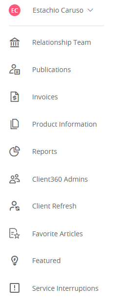 Personal Profile - view and edit your personal information or log out of Client360. If you have admin privileges, you can also navigate to your Admin portal.