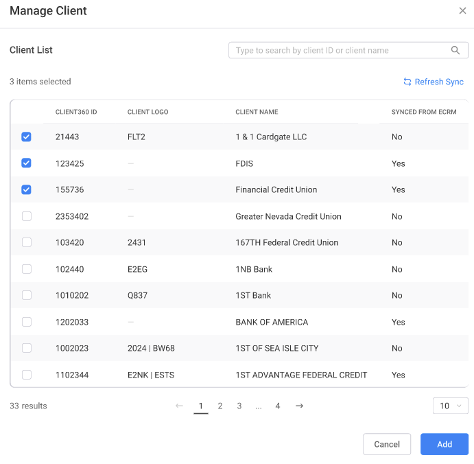 Select Refresh Sync if your client list in eCRM has changed and you want to add the newest clients to your InquiryPoint dashboard.